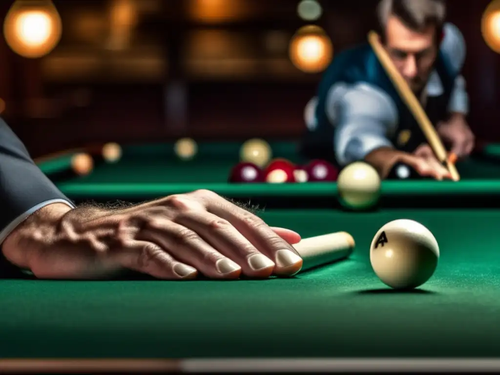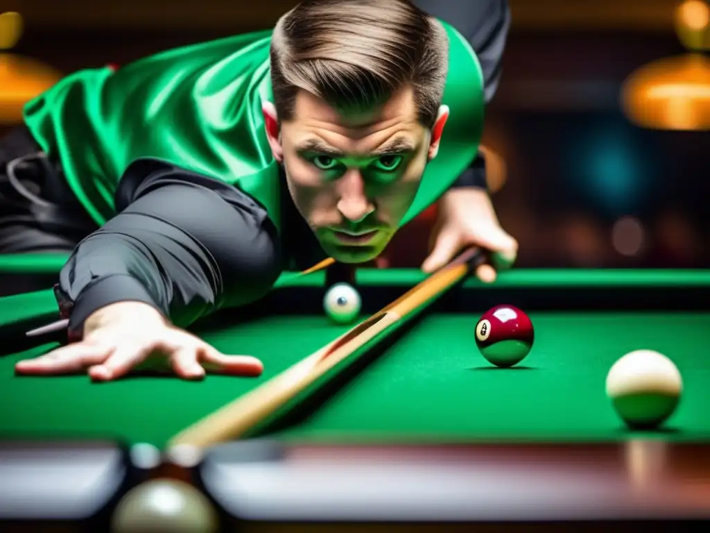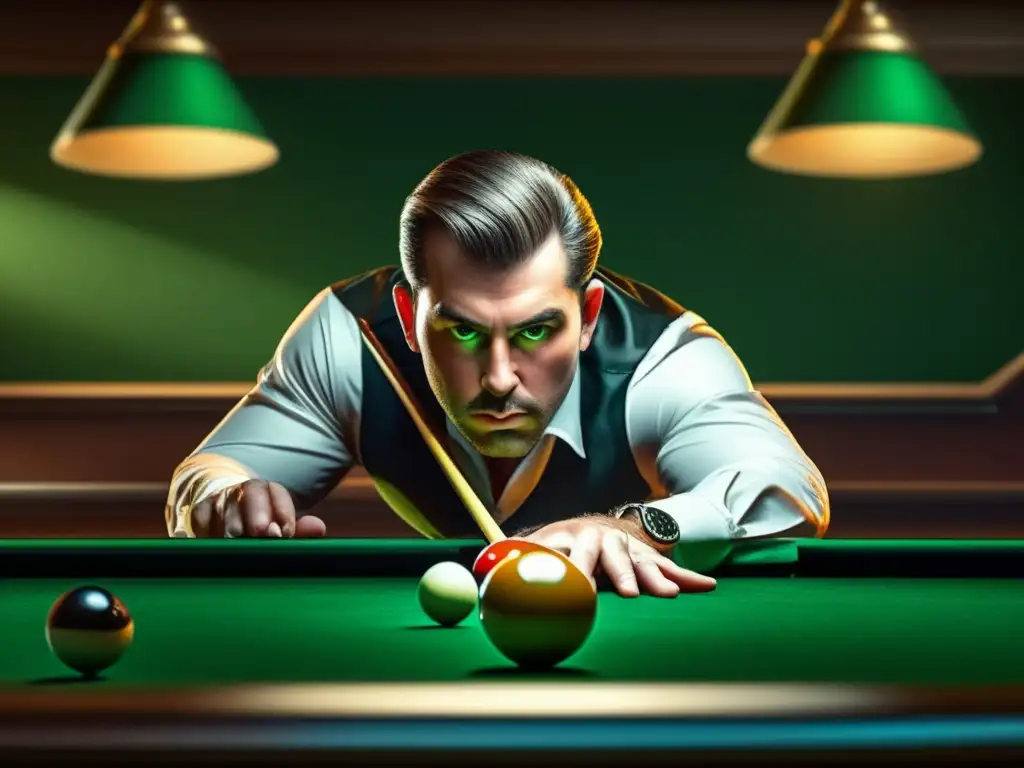 Un jugador de billar profesional, concentrado en su rutina mental para triunfar en el billar, mientras se prepara para un tiro preciso en la mesa.